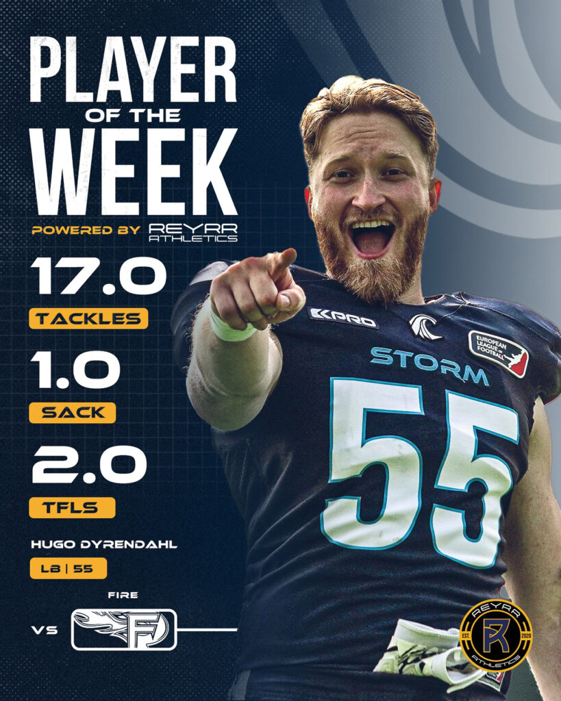Innan serien är slut ligger Hugo på 5:e plats i tacklingsligan (68), senaste matchen mot Rhein Fire spelade han magiskt bra. 17 tacklingar, 1 sack och 2 tackles for loss (TFL) är imponerande bra! Nordic Storm fortsätter obesegrade sin framfart med Hugo och övriga RIG alumni i spetsen.